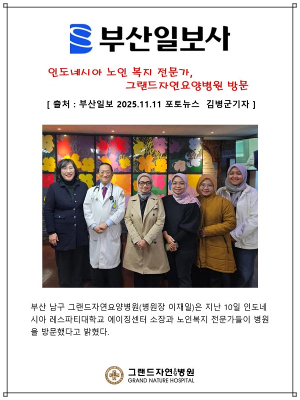 [부산일보] 인도네시아 노인 복지 전문가, 그랜드자연요양병원 방문 페이지 정보 작성자 최고관리자 작성일25-11-17 11:55 조회87회 댓글0건 다음글 목록 본문 [ 출처 : 부산일보 2025. 11.11 포토뉴스 김병군 기자 ] 댓글목록 등록된 댓글이 없습니다. 다음글 목록