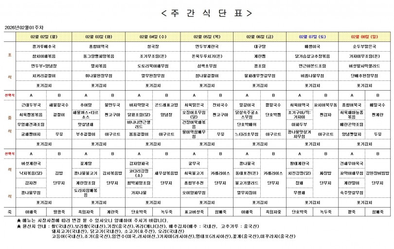 주간 식단표 (2월 1주) 페이지 정보 작성자 최고관리자 작성일26-01-30 14:39 조회6회 댓글0건 다음글 목록 본문 주간 식단표 (2월 1주) 댓글목록 등록된 댓글이 없습니다. 다음글 목록