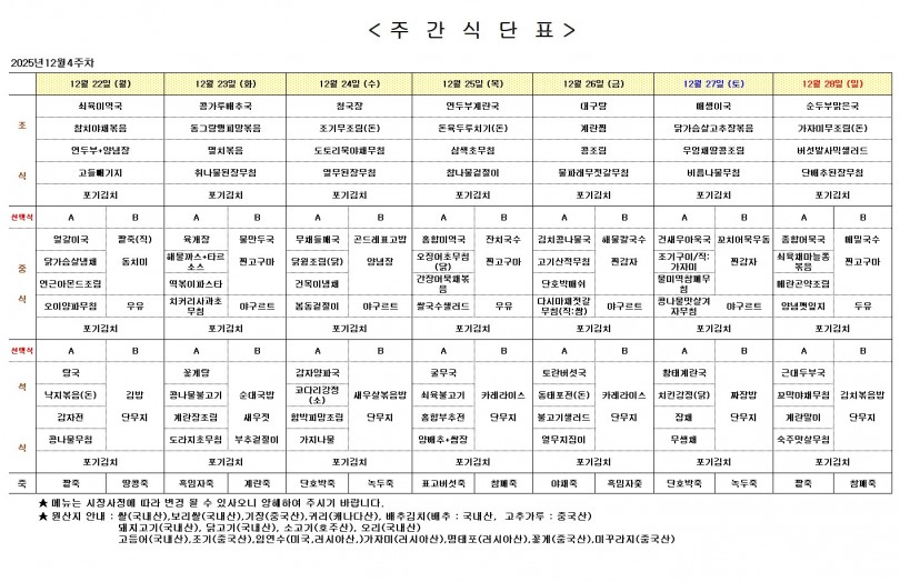 주간 식단표 (12월 4주) 페이지 정보 작성자 최고관리자 작성일25-12-19 10:44 조회16회 댓글0건 다음글 목록 본문 주간 식단표 (12월 4주) 댓글목록 등록된 댓글이 없습니다. 다음글 목록