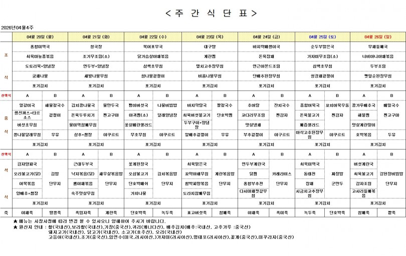 주간 식단표 (4월 4주) 페이지 정보 작성자 최고관리자 작성일26-04-17 10:24 조회45회 댓글0건 이전글 다음글 목록 본문 주간 식단표 (4월 4주) 댓글목록 등록된 댓글이 없습니다. 이전글 다음글 목록