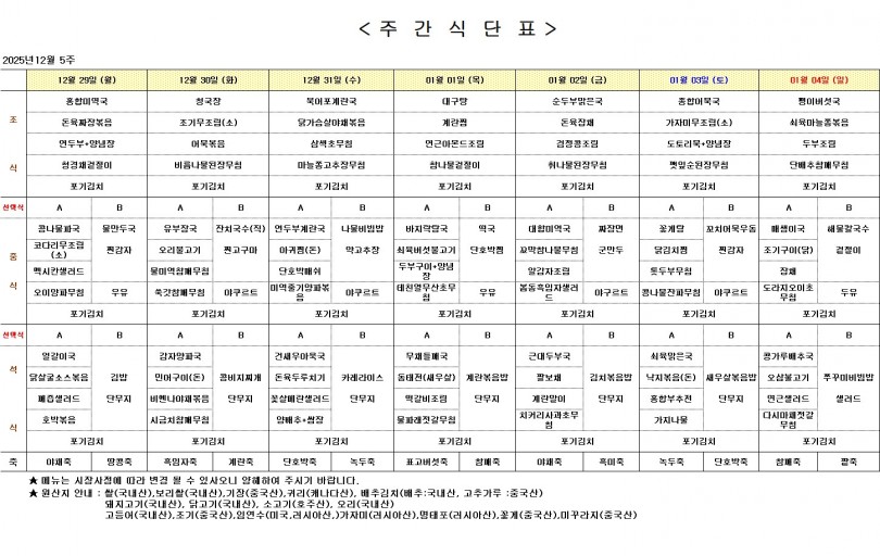 주간 식단표 (12월 5주) 페이지 정보 작성자 최고관리자 작성일25-12-24 11:56 조회22회 댓글0건 다음글 목록 본문 주간 식단표 (12월 5주) 댓글목록 등록된 댓글이 없습니다. 다음글 목록