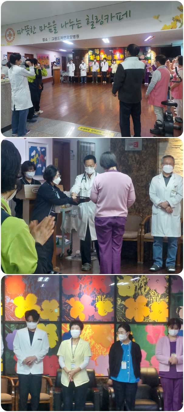 11월 3일 그랜드자연요양병원은 1층 로비에서 전직원들이 참석한 가운데 11월 월례회를 가졌다. 이재일병원장은 11월을 맞은 그랜드 가족 여러분들 모두에게 올 한해 좋은 결실들이 맺어질 수 있게 다시 한 번 점검하는 계절로 거듭나기를 강조하였다. 이어서 QPS위원회 위원과 감염관리위원회 위원의 새로이 임명되는 위원에 대한 임명장을 수여하였다. 또한 수능 자녀를 둔 직원들을 격려하며 수능 대박을 기원하는 마음을 모아 준비한 쵸콜릿을 전달하였다. 따뜻함이 넘치는 11월 월례회를 전직원들은 11월을 준비하는 마음으로 병원 구호를 끝으로 월례회를 마쳤다.