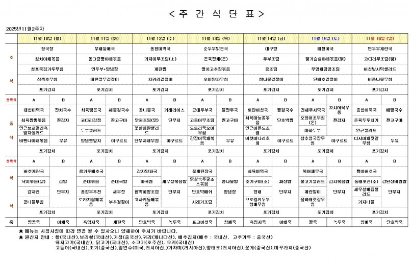 주간 식단표 (11월 2주) 페이지 정보 작성자 최고관리자 작성일25-11-08 11:10 조회17회 댓글0건 다음글 목록 본문 주간 식단표 (11월 2주) 댓글목록 등록된 댓글이 없습니다. 다음글 목록