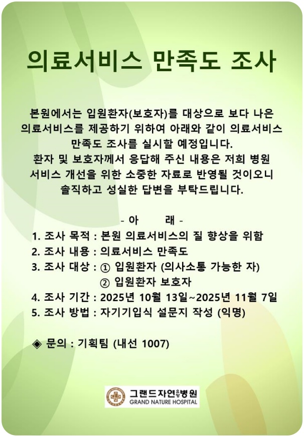 의료서비스 만족도 조사(2025년10월13일~11월7일) 페이지 정보 작성자 최고관리자 작성일25-10-10 12:24 조회19회 댓글0건 이전글 다음글 목록 본문 의료서비스 만족도 조사 댓글목록 등록된 댓글이 없습니다. 이전글 다음글 목록