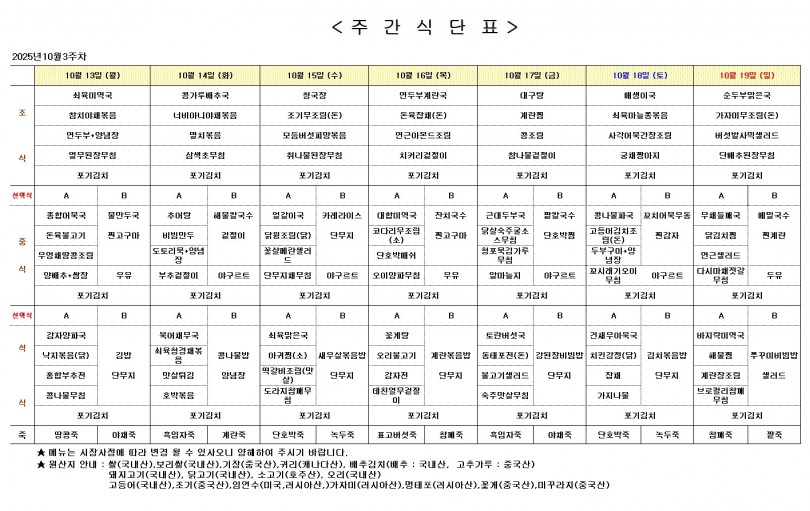 주간 식단표 (10월 3주) 페이지 정보 작성자 최고관리자 작성일25-10-10 15:12 조회36회 댓글0건 다음글 목록 본문 주간 식단표 (10월 3주) 댓글목록 등록된 댓글이 없습니다. 다음글 목록