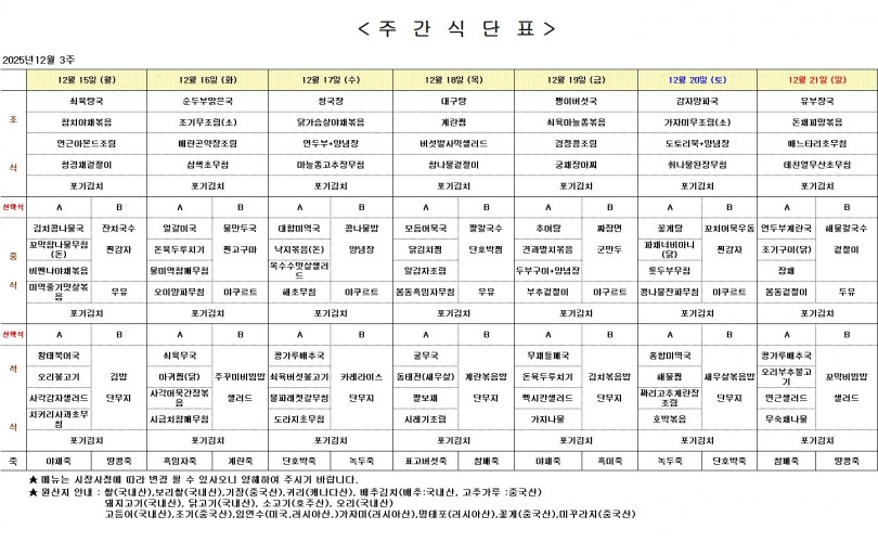 주간 식단표 (12월 3주) 페이지 정보 작성자 최고관리자 작성일25-12-11 15:29 조회31회 댓글0건 다음글 목록 본문 주간 식단표 (12월 3주) 댓글목록 등록된 댓글이 없습니다. 다음글 목록
