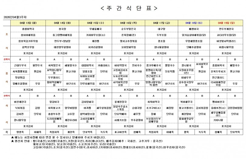 주간 식단표 (4월 3주) 페이지 정보 작성자 최고관리자 작성일26-04-09 10:46 조회61회 댓글0건 다음글 목록 본문 주간 식단표 (4월 3주) 댓글목록 등록된 댓글이 없습니다. 다음글 목록